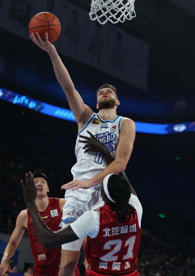新华社照片,北京,2024年10月29日 10月29日,宁波町渥队球员拉科塞维奇(上)在比赛中上篮。 新华社记者 王楷焱 摄